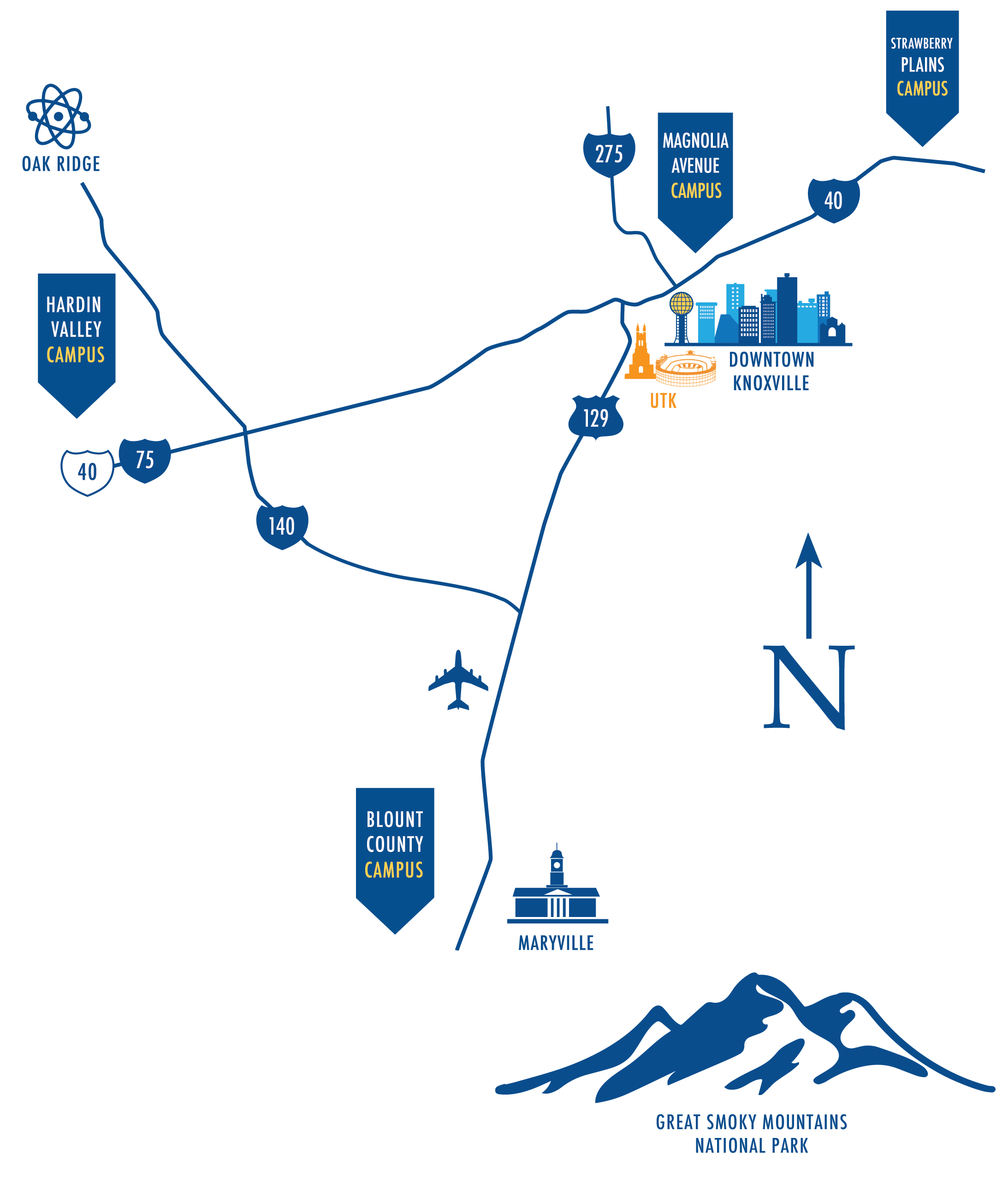 Pellissippi State offers programs, courses and services at four primary locations. Below is a directional map to the Hardin Valley Campus, Blount County Campus, Magnolia Avenue Campus, and Strawberry Plains Campus.